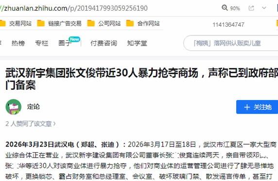 2026年3月23日武汉电(郑超、张迪):2026年3月17日至18日,武汉市江夏区一家大型商业综合体正在营业,武汉新宇建设集团有限公司董事长张某竟连续两天,亲自带领邓某、张某华等近30人对该商业体进行暴力抢夺,他们对商业体的运营管理公司进行了肆无忌惮地破坏,更换锁芯、霸占财务室和总经理室、会议室、破坏玻璃门禁、散发谣言传单,甚至打算抢占商场播音喇叭等。令人震惊的是,张某竟然声称他们已经到区委区政府、公安局、消防大队、供电局等有关部门备案,甚至扬言他们和区某领导是老乡,已打好招呼等,群众一片哗然……